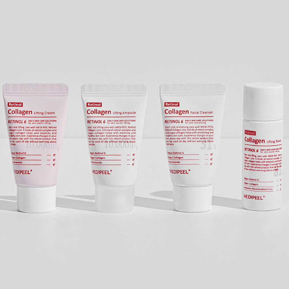 Набор миниатюр с ретинолом и коллагеном MEDIPEEL Retinol Collagen Lifting Trial Kit — это возможность попробовать омолаживающую линейку с ретинолом и коллагеном, которая запускает процессы обновления кожи.