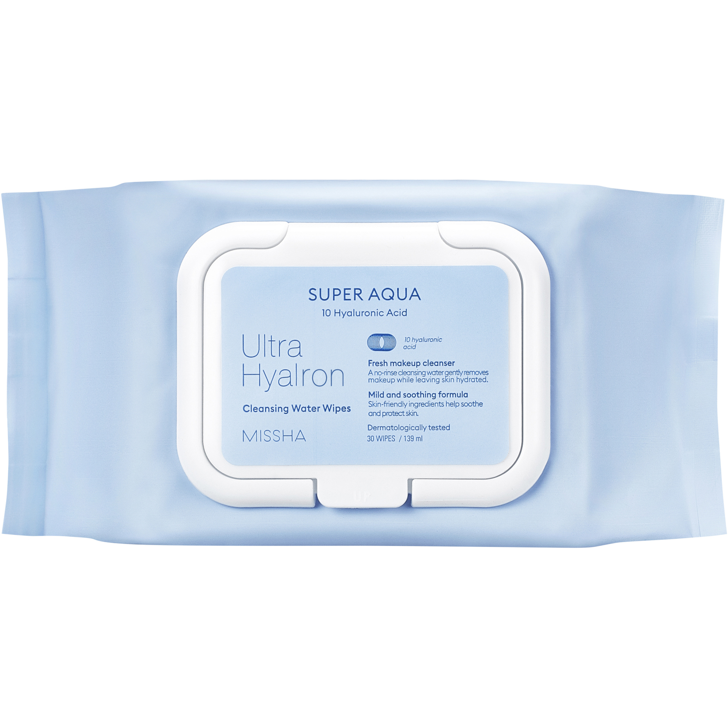 Влажные салфетки MISSHA Super Aqua Ultra Hyalron Cleansing Water Wipes – быстрый и удобный способ удалить макияж и очистить кожу от излишков себума, пыли и загрязнений. Снимают макияж в любом месте, в любое время. Удаляют любую косметику, которая забивает поры. Полностью удаляют макияж без стресса для кожи. Идеальны, когда Вы устали или хотите быстро поправить макияж. Обильно пропитанные мицеллярной водой и ухаживающими природными компонентами, мягкие очищающие салфетки легко и без остатка удалят даже водостойкую тушь, кремовые и шиммерные тени, подводку, хайлайтер, румяна, помаду и любые виды тональных основ, включая BB-крем. Гипоаллергенная формула подходит для всех типов кожи, включая чувствительную. А благодаря размеру, одной салфеткой можно снять весь макияж.