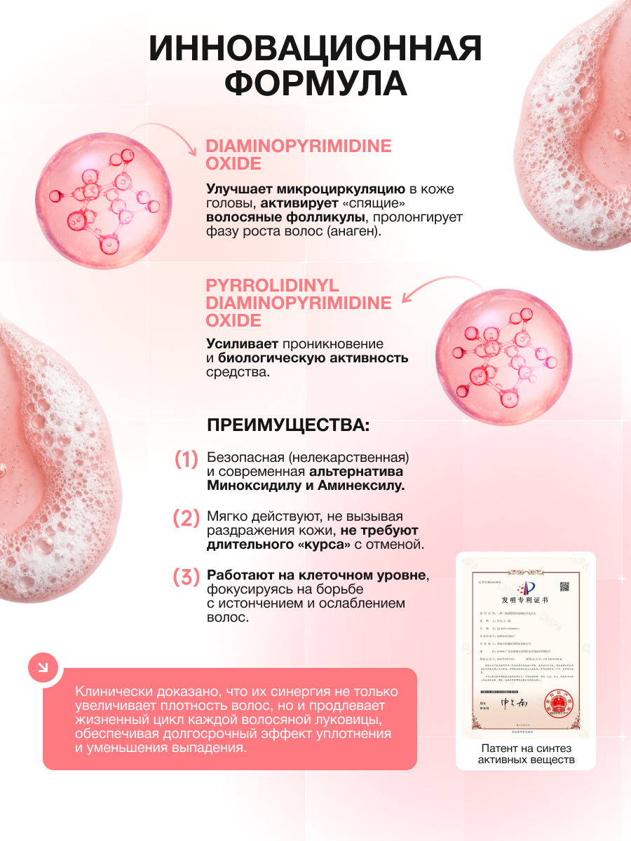 • Комплекс на основе признанных мировых активов от выпадения волос: Diaminopyrimidine Oxide и Pyrrolidinyl Diaminopyrimidine Oxide, полученных по запатентованной технологии синтеза и очистки, помогает укреплять волосы у корней и повышать их жизненный тонус, за счет улучшения системы питания фолликулов.