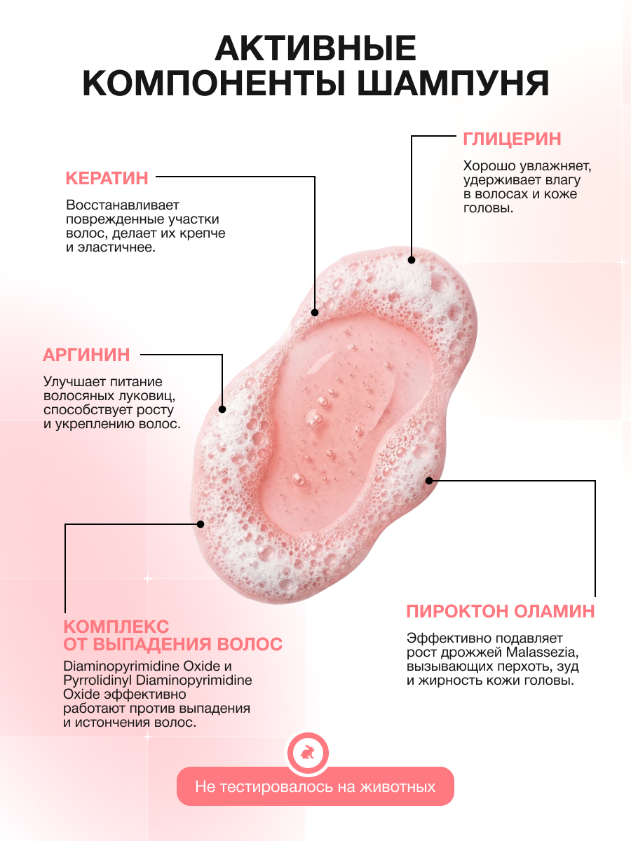 Шампунь: нанесите на влажные волосы и кожу головы, вспеньте, помассируйте 1–2 минуты, тщательно смойте. При необходимости повторите.