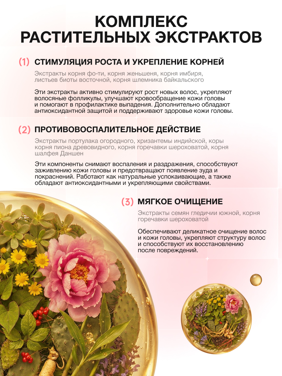 • Экстракты женьшеня, имбиря, горечавки и солодки помогают тонизировать кожу головы и поддерживать ощущение свежести.